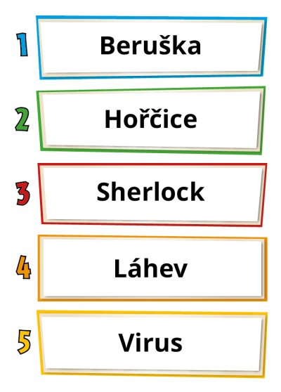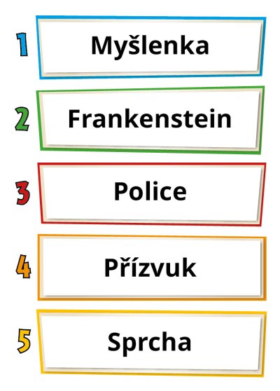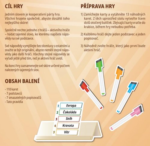 Obsah balení: 110 karet 7 podstavců 7 smazatelných popisovačů česká a slovenská pravidla (karty jsou pouze v českém jazyce)