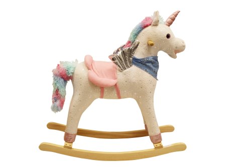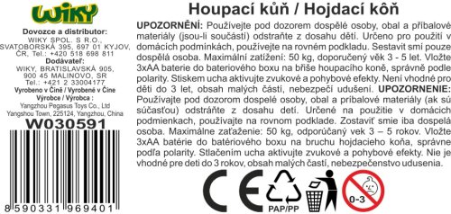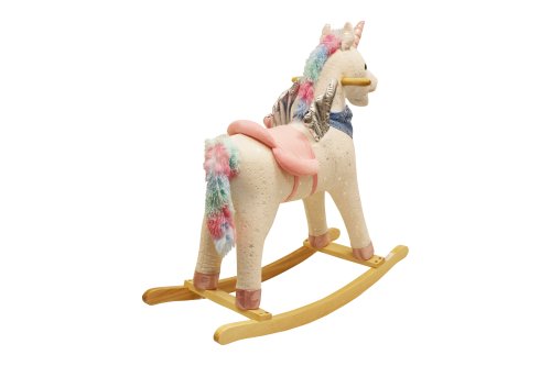 Jednorožec houpací s efekty duhový. Rozměry 74 x 33 x 65 cm. Výška sedla 42 cm. Vydává zvukové efekty, hýbe tlamou a ocasem. Aktivace tlačítkem v uchu. Přihrádka na baterie se nachází na břiše jednorožce. 3xAA baterie nejsou součástí.