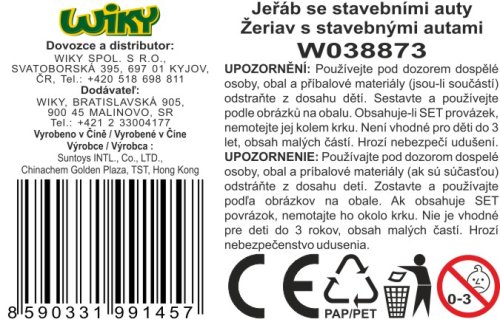Jeřáb se 2 stavebními auty. Velikost jeřábu 57 cm. Manuální jeřáb na kliku, otočné rameno o 360 stupňů. Obsahuje jeřáb, 2 stavební auta, 2 figurky stavebníků, 2 barely, 2 závory, stavební materiál a další. Obrázkový návod na složení na zadní straně obalu.