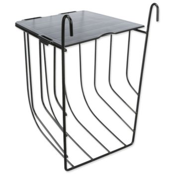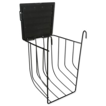 Závěsné kovové jesličky na seno s víkem v černé barvě.