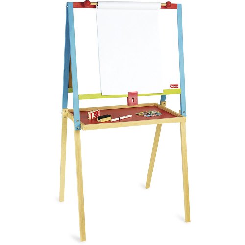 Dvojice tabulí na rozkročené dřevěné konstrukci vybavené velkým odkládacím či úložným prostorem. Na černou tabuli se píše a kreslí křídou, bílou tabuli lze popisovat zvlášť určenými fixy a mazat plstěnou houbičkou. Součástí výbavy je také držák na role papíru, které jsou dodávány zvlášť jako příslušenství. Vyrobeno ve Francii, z masivního bukového a borovicového dřeva francouzského původu. Součásti jsou ošetřeny výhradně za použití barev a laků na bázi vody. Baleno v kartonu potištěném rostlinnými inkousty. Součástí balení jsou křídy, fix, houbička, sada vzorovaných magnetických písmen, kolíček a role papíru. Hlavní vlastnosti:tabule, 3 křídy, fix, houbička, sada magnetických písmen, kolíček a role papírurozměry tabule 56x43 cmpro křídy/magnetická pro fixydržák pro papírové rolevelký odkládací prostorvyrobeno ve Francii