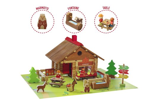 Co může být krásnější než procházky v horách? Procvičte svou obratnost a představivost při stavbě útočiště svišťů! Tento krásný domeček z mořeného dřeva je opatřen také piknikovým stolem, fontánou či roztomilými obyvateli (např. oslem, kamzíkem a svištěm). Stavebnice Jeujura Constructions mají dlouhou tradici a patří mezi klasické francouzské hračky. Nabízí série tématicky věnované chatám, domkům a farmám, ale také divokému západu a středověku. Dají se mezi sebou volně kombinovat a k řadě z nich je také nabízeno příslušenství, figurky a vozidla. Jsou vyráběny ve Francii, z masivního bukového a borovicového dřeva francouzského původu. Dílky jsou ošetřeny výhradně za použití barev a laků na bázi vody. Každá sada je balena v praktickém lepenkovém kufříku potištěném rostlinnými inkousty a součástí balení je snadno pochopitelný návod. Hlavní vlastnosti: 150 dílků z masivního dřeva a podložkapraktické balenívyrobeno ve Francii