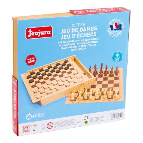 Klasické deskové hry v praktickém provedení do škol, kluboven či domácností. Sada je vyráběna ve Francii, z masivního bukového a borovicového dřeva francouzského původu. Všechny součásti jsou ošetřeny výhradně za použití barev a laků na bázi vody. Hlavní vlastnosti:obsahuje šachové figurky i hrací kameny pro dámuvšechny součásti z masivního dřevapraktické balenívyrobeno ve Francii