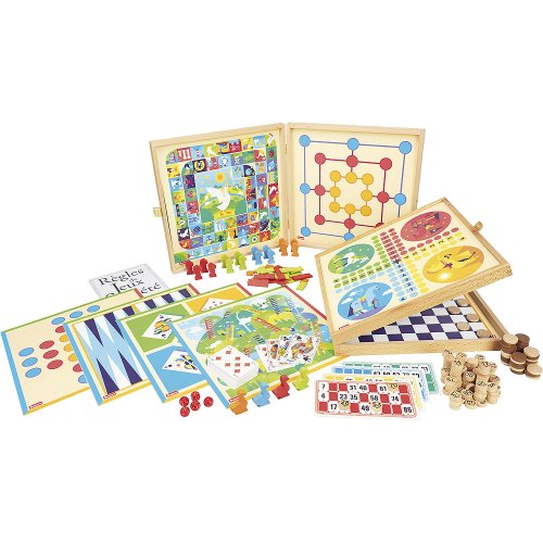 Rozsáhlý soubor stolních, deskových a karetních her v uceleném praktickém balení. Naleznete zde dámu, mlýn, variantu člověče nezlob se s figurkami koní, husu a soubor obsahuje také balíček bridžových karet a žetony i kartičky pro bingo. Příslušenství ke hrám je společně s pravidly baleno v boxu, jehož plochy slouží jako herní desky. Souprava je vyráběna ve Francii, z masivního bukového a borovicového dřeva francouzského původu. Dřevěné součásti jsou ošetřeny výhradně za použití barev a laků na bázi vody, papírové příslušenství je potištěno rostlinnými inkousty. Hlavní vlastnosti:16 figurek koní, 4 figurky hus, 40 hracích kamenů, 5 kostek, dva druhy žetonů a 54 karetsoučásti z masivního dřevapraktické balenívyrobeno ve Francii