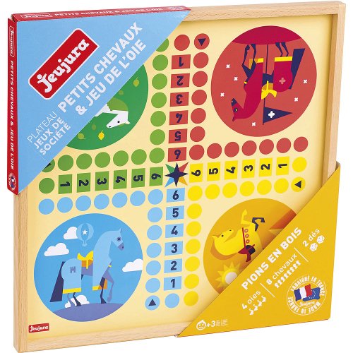 Deska s dvojicí her. Obsahuje husu a variantu člověče nezlob se s figurkami koní. Souprava je vyráběna ve Francii, z masivního bukového a borovicového dřeva francouzského původu. Součásti jsou ošetřeny výhradně za použití barev a laků na bázi vody. Hlavní vlastnosti:pro 2–4 hráče8 figurek koní, 4 figurky hus a 2 kostkyvšechny součásti z masivního dřevavyrobeno ve Francii Pravidla her: Člověče nezlob se: Cílem hry je obejít s koňmi hrací pole a dostat je do domečku. Všechny figurky jsou před začátkem hry umístěny ve startovním domečku, který je vyznačen stejnou barvou jako figurky. Hraje se ve směru hodinových ručiček. Hráči házejí kostkou při každém tahu. Figurky posouvejte o tolik bodů, kolik padlo při hodu kostkou. Pokud figurka skončí na políčku obsazeném cizí figurkou, je tato odstraněna ze hry a vrácena zpět do domečku. Na políčko obsazené jinou vlastní figurkou vstoupit nelze. Aby hráč mohl nasadit do hry novou figurku, musí hodit šestku. Pokud nemá hráč ve hře žádnou figurku, hází, dokud mu nepadne šestka, maximálně však 3×. Pokud hodí šestku umístí koně na startovní políčko stáje a hraje znovu. Aby hráč ukončil kolo, musí jeho kůň přejít na všechna políčka stáje označená 1 až 6. Husí hra: Cílem hry je vstoupit na vítězné políčko č. 63. Před začátkem hry si každý hráč zvolí svou figurku husy. Poté každý z nich hodí oběma kostkami zároveň. Hráč, který hodil nejvyšší číslo, začíná. Figurky posouvejte o tolik bodů, kolik padlo při hodu kostkou. Jestliže skončíte na políčku s obrázkem husy, máte štěstí – posuňte svou figurku znovu o stejný počet polí. Když hodíte šestku a trojku při prvním tahu, posouváte se na pole č. 26.Pokud hodíte čtyřku a pětku, posouváte se na pole č. 53.Pokud šlápnete na pole č. 6, posouváte se na pole č. 12.„Ten, kdo jde lovit, ztrácí své místo…“ Na políčku č. 22 se musíte posunout o 3 pole zpět.Abyste se dostali ze studny na poli č. 30, musíte hodit šestku.Na poli č. 35 se dostanete do hotelu, jedno kolo stojíte.Bludiště na poli č. 42 vás pošle zpátky na pole č. 31.Ve vězení, na poli č. 52 stojíte dvě kola.Na poli č. 58 se ztratíte v žaláři a musíte se vrátit zpět na start.Pokud hodíte takové číslo, které by Vás dostalo za pole č. 63, musíte se o tolik polí posunout zpět po herní ploše.