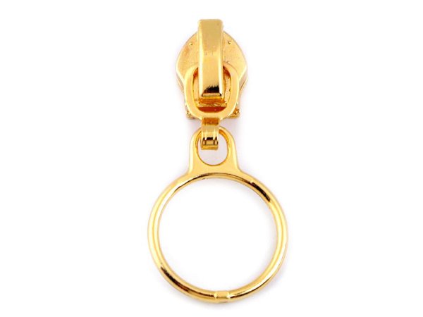 Kovový jezdec s táhlem v podobě kroužku je určený ke spirálovým zipům v metráži, které u nás najdete pod kódem 790304, 800963, [750994, 750503, 790305]. Průměr kroužku je 20 mm.
