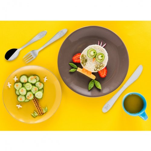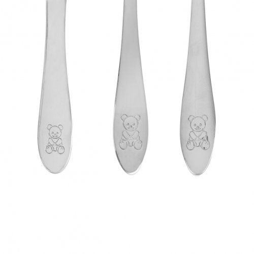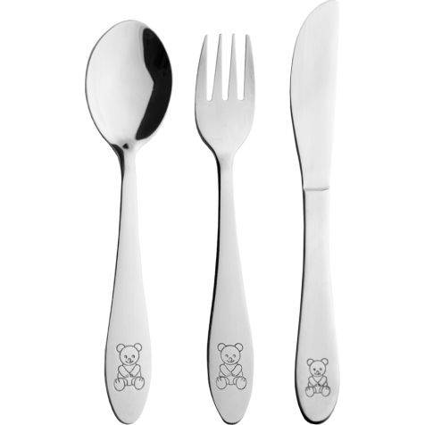 Příbory s rytým motivem medvídka slouží pro nácvik správného stolování .
