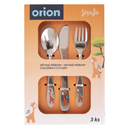 Sada dětských příborů s barevným dekorem žirafy. Obsahuje lžíci, vidlišku a nůž. Nerezový materiál 18/0. Nedoporučujeme mýt v myčce na nádobí (možné porušení barevného obrázku). Délka 15.5 cm (lžíce a vidlička) a 17 cm (nůž). EAN 8592381156183