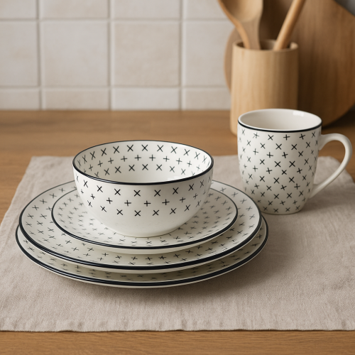 Stylová jídelní sada z kvalitního porcelánu s černým kosočtvercovým vzorem a černým okrajem, ideální pro každodenní i slavnostní stolování.