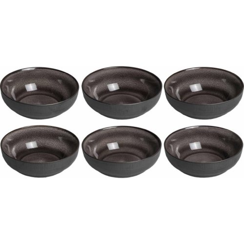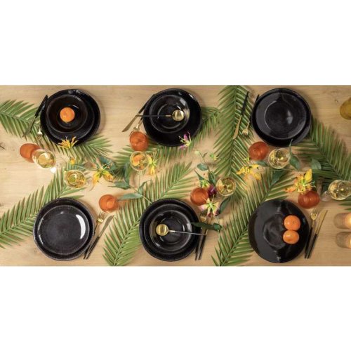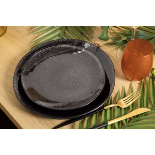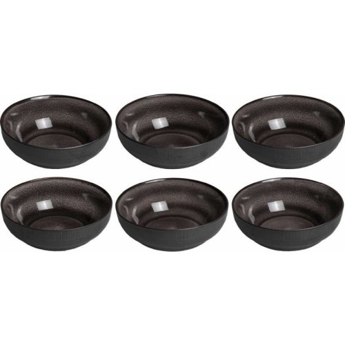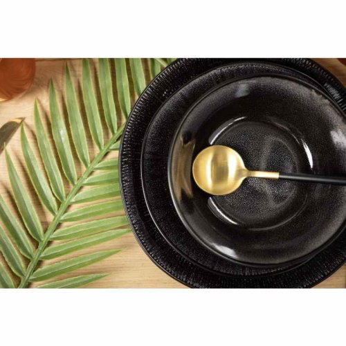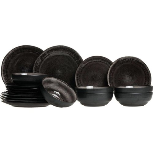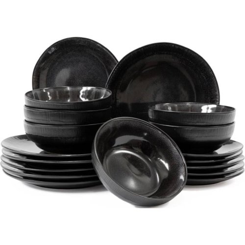 18dílná sada nádobí. S touto stylovou černou sadou se každá večeře stane zvláštní příležitostí. Glazura na této sadě dělá každý kus jedinečným. Nádobí je vyrobeno z kameniny a je vhodné do myčky. Sada je vhodná pro 6 osob.6 jídelních talířů O 27 cm 6 snídaňových talířů O 20,5 cm 6 misek O 17 cm
