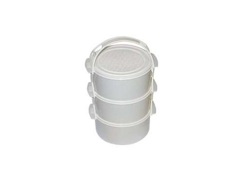 Box na ukládání a přepravu jídla, složený ze 3 dílů, které jsou navzájem propojené držadlem.