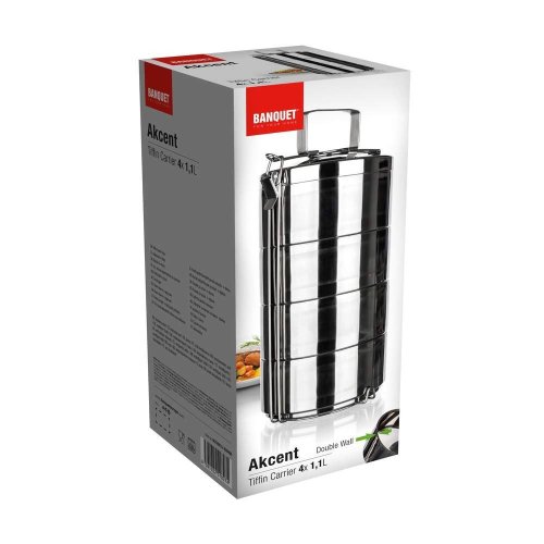 Už vás omrzely neustále zmačkané jednorázové polystyrenové misky na jídlo? Pořiďte si u nás kvalitní nerezový jídlonosič Akcent značky Banquet, se kterým jídlo jednoduše a bezpečně přenesete. Touto 4dílnou sadou misek o objemu 1,1 l můžete bez obav vybavit manžela do práce. Díky průměru 16 cm a výšce 7,5 cm jsou totiž vhodné pro větší porce jídla.