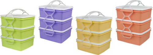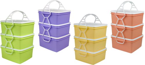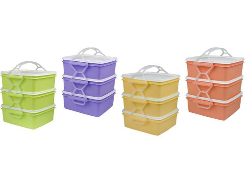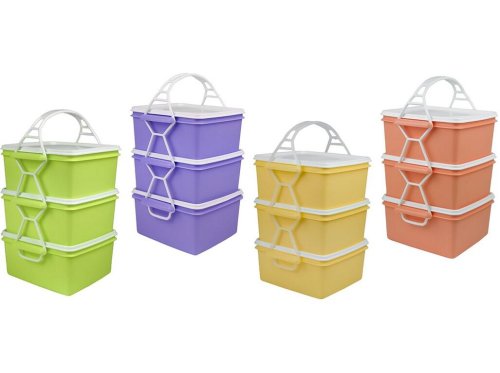 Plastový jídlonosič, čtveratý tvar, misky 3 x 1.2 litru. Možnost dokoupení náhraního ucha. Vhodné do myčky nádobí bez víčka. Barvy dle skladové dostupnosti. Český výrobce. EAN 8594028843760
