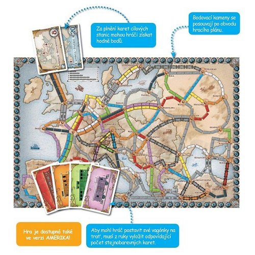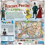 Veleúspěšná hra o stavbě železnic po celé Evropě. Ze strmých strání Edinburghu po sluncem zalité doky Cařihradu, přes prašné uličky Pamplony až po větrem zametanou stanici v Berlíně. Jízdenky, prosím! Vás vezme na nové vlakové dobrodružství skrze velká města Evropy konce 19. století. Odvážíte se riskovat cestu temnými tunely Švýcarska? Cestovat na palubě trajektu přes Černé moře? Nebo budete stavět nádraží v hlavních městech starých říší? Váš příští krok z Vás může učinit největšího vlakového magnáta Evropy! Jízdenky, prosím! - Evropa je další hra ze série skvělých vlakových dobrodružství. Hráči sbírají barevné karty železničních vagónů a s jejich pomocí staví nádraží, projíždějí tunely, naloďují se na trajekty a spojují tratě napříč Evropou. To vše je postaveno na jednoduchých pravidlech, která hráče přímo vybízejí ke konkurenčnímu boji s protivníky. A právě na něm je založena neobyčejná krása této hry - neexistuje totiž nic příjemnějšího než na poslední chvíli postavit koleje tak, abyste přebrali soupeři nejdelší cestu a zároveň mu tak zabránili v jejím dalším prodlužování. Když k jednoduchým pravidlům popisujícím velmi zábavnou hru přidáte i rozumnou herní dobu (přibližně 45 min.) a skutečně fungující systém i v případě dvou hráčů, určitě chápete, proč hra získala mnoho ocenění a proč se celosvětově prodalo více než 6 milionů kopií hry ze série Jízdenky, prosím! (Ticket to Ride).