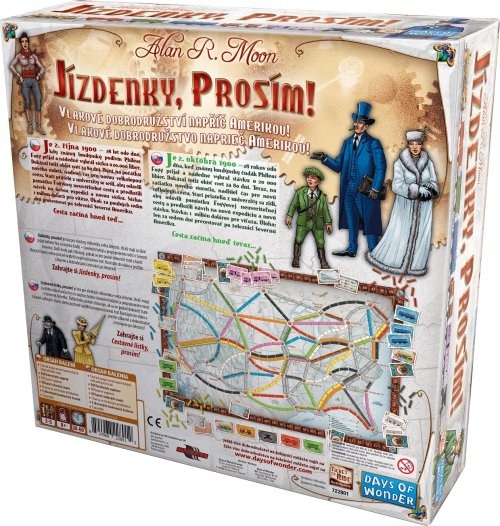 Jízdenky, prosím! je veleúspěšná hra oceněná titulem "Hra roku", která je určená pro všechny milovníky světa železnic a dobré rodinné zábavy. Hráči mají za úkol získat během hry co nejvíce bodů - stavěním kolejí a propojováním měst v Severní Americe. Další body pak získávají, pokud se jim podaří dokončit tratě z karet cílových stanic nebo postaví nejdelší nepřerušovanou trať. To vše je postaveno na jednoduchých pravidlech, která se dají naučit doslova za pár minut! Nastupte do vlaku a prožijte se svojí rodinou nebo přáteli zábavné a dobrodružné cestování po železnici!