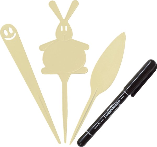 Jmenovky zapichovací k popisům rostlin a výsevů. Sada obsahuje 9 kusů jmenovek a lihový fix.