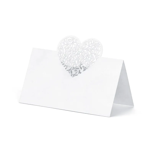 Jmenovky na stůl stavební 10ks 9 x 6.5cm bílé srdce - PartyDeco