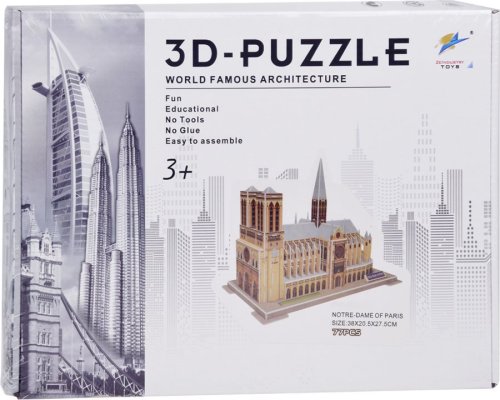 Sestavený model Katedrály Notre-Dame je krásná a detailní miniatura slavného pařížského monumentu. Je to ideální dekorace do domácnosti, která připomíná bohatou historii a jedinečnou architekturu tohoto místa. 3D puzzle Katedrály Notre-Dame v Paříži je jedinečný model o 77 dílcích, který vám umožní postavit trojrozměrnou repliku jednoho z nejslavnějších francouzských památníků. Vlastnosti puzzle: