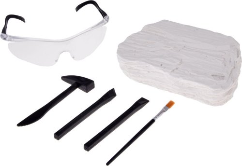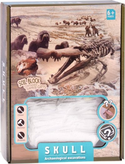 Kreativní archeologická sada pro malé dobrodruhy. V sádrovém bloku je ukryta náhodná fosilie – lebka mamuta, šavlozubého tygra, orla, krokodýla a dalších tvorů. S přiloženým nářadím děti lebku postupně odhalí a očistí, čímž si procvičí trpělivost, jemnou motoriku a zažijí pocit skutečného objevitele. Obsah sady