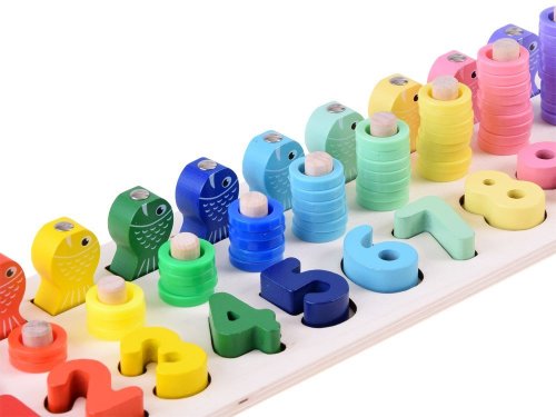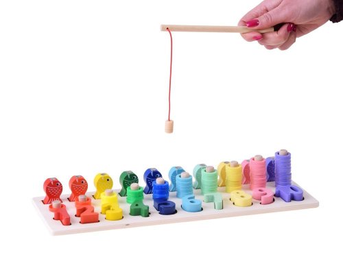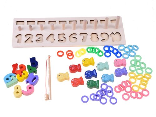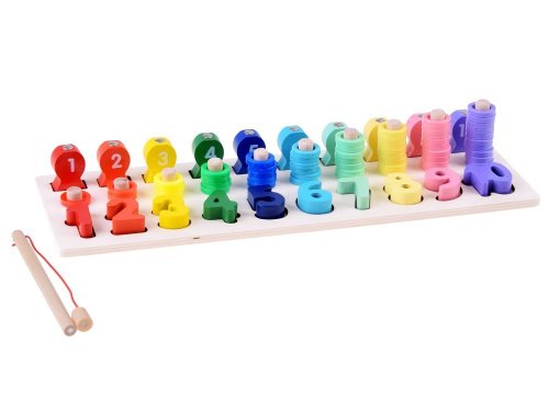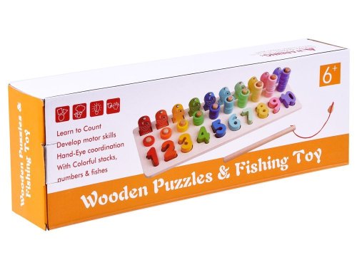 Nejlepší formou vzdělávání je učení se hrou. Díky této hádance se dítě naučí čísla od 1 do 10 zábavným způsobem. Sada obsahuje: - dřevěný podstavec s čísly a kolíky - čísla od 1 do 10 - dřevěné očíslované ryby - 55 plastových kroužků v 10 barvách - rybářský prut s magnetem Hádanka Vám umožní cvičit úkoly s různým stupněm obtížnosti s V aším dítětem. 1. přizpůsobení tvarů - při hraní se dítě naučí rozlišovat tvary jednotlivých čísel 2. rybolov - pomocí rybářského prutu s magnetem uspořádejte očíslované ryby na správné místa. 3. použití správného množství kroužků - Dítě se učí hodnotě dané číslice, učí se počítat do 10. S hračkou můžete také zacházet jako s počítadlem.