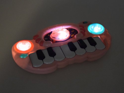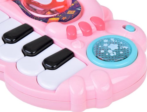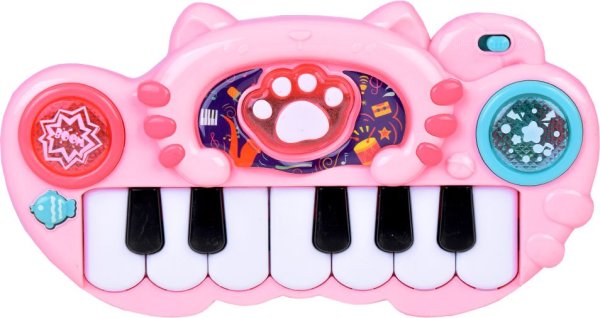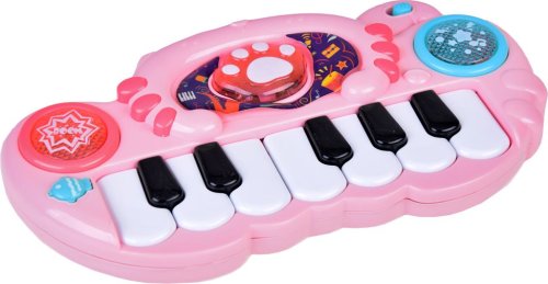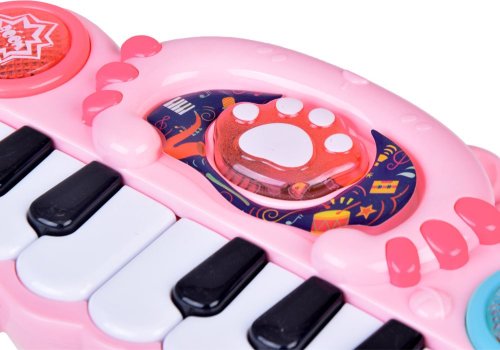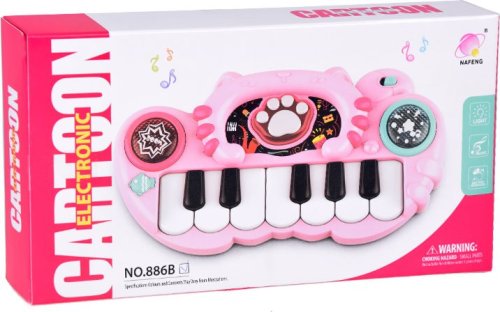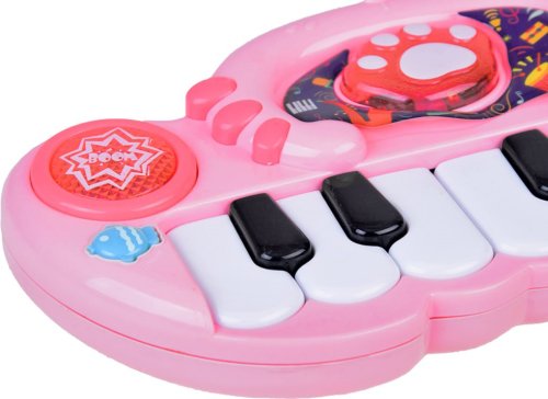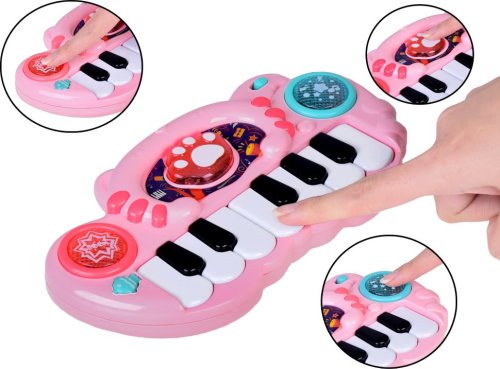 Osvětlená tlačítka vydávají zvuky bubnů a činelů. Růžová tlapka přehrává krátké veselé melodie se současným podsvícením kulatých tlačítek. Černé a bílé klávesy hrají základní tóny stupnice. Každé stisknutí klávesy doprovází světelný efekt umístěný na panelu hračky. Hračka je vybavena prvky, které rozvíjejí manuální zručnost dítěte, díky přesnému stisknutí kláves. Rozměry varhánek: 22 x 12 x 3,5 cm Napájení: 2 x 1,5 V AA baterie (nejsou součástí balení)