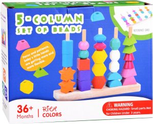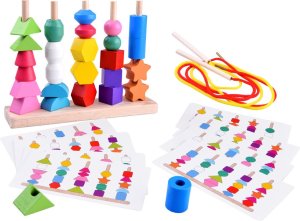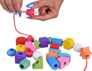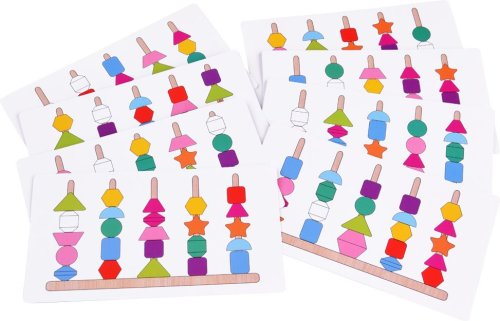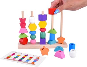 pozitivně ovlivňuje schopnost rozlišovat tvary, barvy a koordinaci ruka-oko, dítě si může hrát dvěma způsoby – nasazováním kostek na kolíky podle přiložených karet nebo navlékáním na provázek, kostky s intenzivními, výraznými barvami jistě upoutají pozornost mnoha dětí a povzbudí je ke hře, sada obsahuje: 25 kostek různých barev a tvarů, podstavec s 5 kolíky, 2 navíjecí provázky a karty s úkoly.