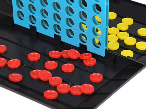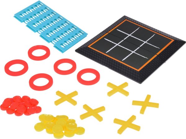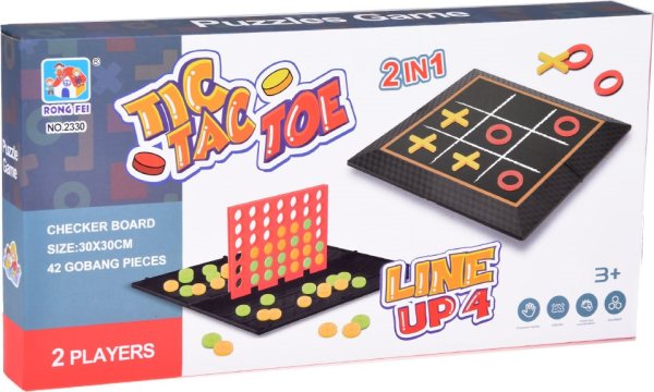 Počet hráčů: 2 Základna hry zároveň slouží jako úložný box pro všechny herní prvky. Po rozložení získáme tradiční herní desku na piškvorky s 9 políčky. Pravidla hry jsou jednoduchá – hráči si rozdělí symboly (kolečka a křížky) a střídavě umisťují prvky na vybrané pole. Jeden tah odpovídá umístění jednoho prvku. První hráč, který vytvoří řadu tří svých symbolů, vyhrává. Po otočení desky získáme základnu pro hraní Čtyři v řadě. Desku vložíme do základny a hráči si rozdělí žetony podle barvy. Žetony se vkládají do desky a hra pokračuje, dokud jeden z hráčů neumisťuje čtyři své žetony v řadě (svisle, vodorovně nebo diagonálně). Použijte logické myšlení a taktiku, abyste zablokovali soupeře a jako první vytvořili řadu! Rozměry rozložené základny cca 30 x 30 x 1,5 cm.