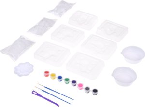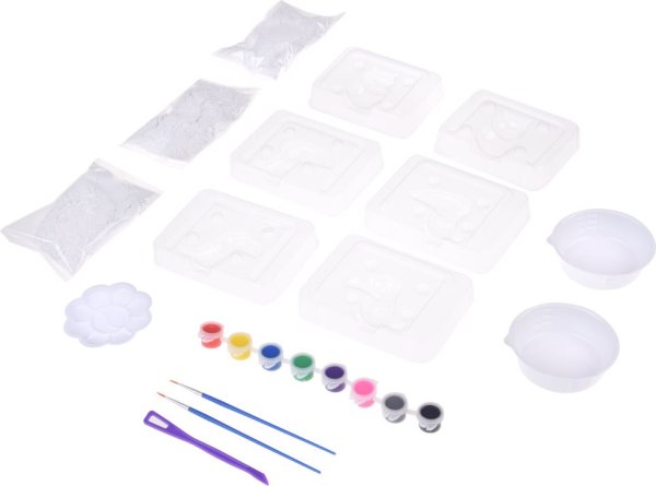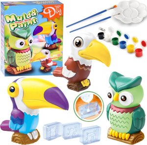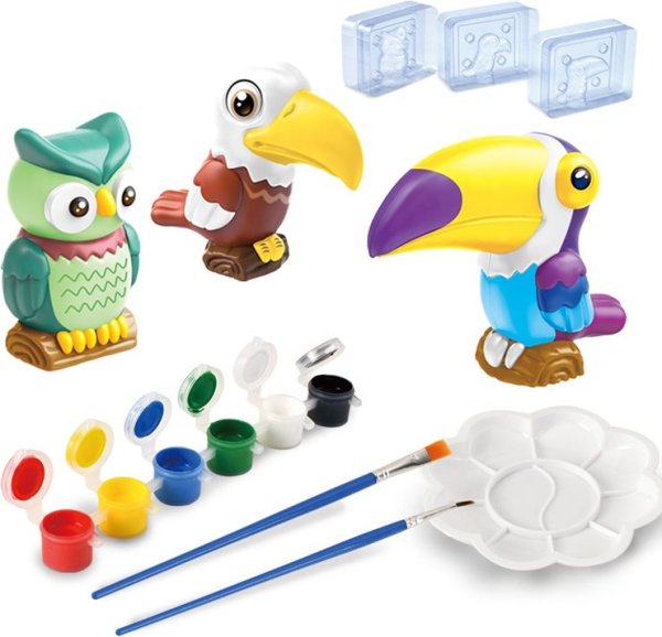 Sada umožňuje vyrobit trojrozměrné figurky exotických ptáků ze sádry a ozdobit je podle vlastní fantazie. Jednoduchý a zábavný proces od odlévání až po malování. Skvělý způsob, jak rozvíjet jemnou motoriku, kreativitu, trpělivost a soustředění. Hotové figurky poslouží jako originální dekorace, nebo ručně vyrobený dárek. Sada obsahuje: 3 sáčky sádry, 3 formičky na odlévání, 2 odměrky, 1 podstavec pro míchání barev, 8 barev, 2 štětce, 1 nůž.