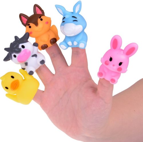 Obsah balení: 5 gumových maňásků na prsty – zvířátka z farmy (králík, kráva, pes, kachna, osel). Rozměry každého maňáska: cca 5 × 4 × 4 cm.