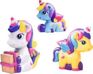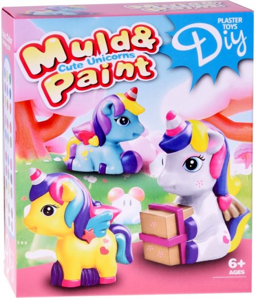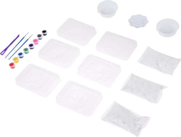 Sada obsahuje : 3 sáčky se sádrou, 3 formy na odlévání jednorožců, 2 odměrky, 1 paleta na míchání barev, 8 barev, 2 štětce, 1 plastový nožík