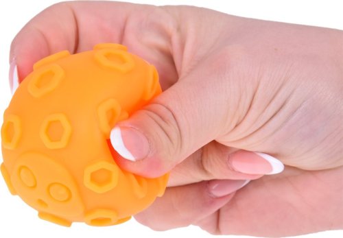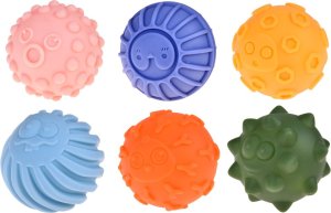 Barevné senzorické míčky jsou skvělou volbou pro hru, cvičení, masáž i smyslovou terapii. Jsou vyrobeny z měkkého, snadno omyvatelného materiálu, který je bezpečný a příjemný na dotek. Při stisknutí vydávají zvuk, což děti motivuje k dalšímu objevování. Každý z 6 míčků má jiný tvar a povrch – různé výstupky stimulují hmat a smyslové receptory, čímž přispívají k rozvoji senzorického vnímání dítěte. Výhody a použití: