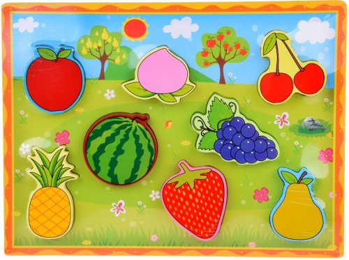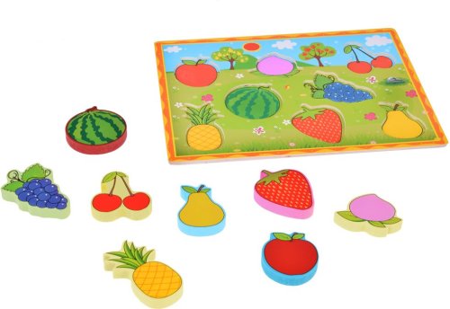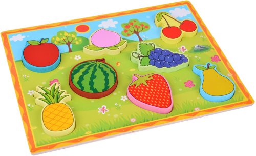 Lahodná skládačka, kde hraje hlavní roli ovoce! Dřevěná skládačka spojuje vzdělávání a zábavu. Úkolem dítěte je přiřadit jednotlivé ovoce k otvorům na desce na základě ilustrací a tvarů. Skládačka rozvíjí vnímavost, schopnost porovnávání, logické myšlení, koordinaci oka a ruky a jemnou motoriku. Barevné ilustrace navíc slouží jako impulz k zahájení vzdělávání o zdravém stravování. Skládačka je vyrobena ze dřeva, což jí dodává pevnost a odolnost. Nemá žádné ostré hrany, takže je pro dítě zcela bezpečná. Barevné ilustrace dělají hračku vizuálně atraktivní a povzbuzují děti ke hře. Jednotlivé prvky jsou velké a masivní, takže je dítě snadno uchopí a umístí na správné místo. Skládačka obsahuje 8 prvků. Rozměry desky: Cca 30 cm x 22,5 cm x 1,5 cm.