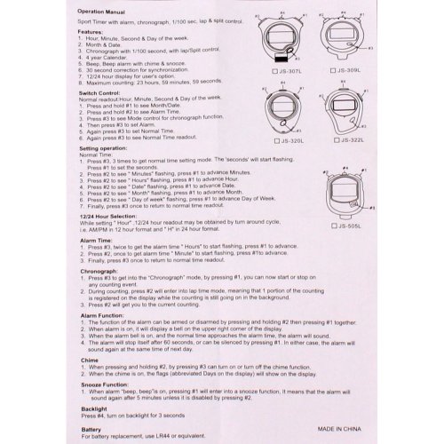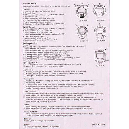 Sportovní stopky JUNSD JS-322L jsou díky své nízké ceně a jednoduchému ovládání vhodné pro každého trenéra, školy, sportovní oddíly nebo sportovce, kteří chtějí mít přehled o časech svých výkonů. Oproti klasickému modelu JS-322 nabízí navíc praktickou funkci podsvícení displeje. Součástí balení je i šňůrka na krk. Funkce: - hodiny, minuty, sekundy & dny v týdnu - datum - stopky s přesností 1/100 sekundy - alarm - 30 sekundová korekce pro synchronizaci - 12/24 hodinový displej - maximální počet: 23h 59min 59sek - podsvícení displeje
