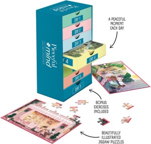 Vyhraďte si každý den 20 minut a složte si jeden motiv denně po dobu 6 dnů. Poslední den si užijte překvapivé odhalení puzzle, cvičení mindfulness a relaxační omalovánky. Skládání puzzle může snížit stres, zlepšit koncentraci a zlepšit náladu.