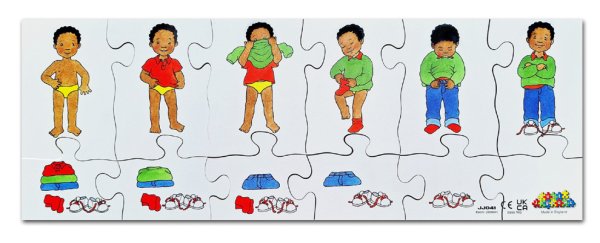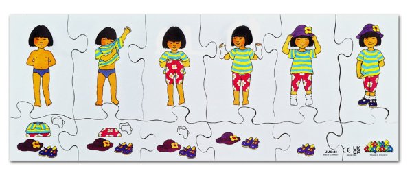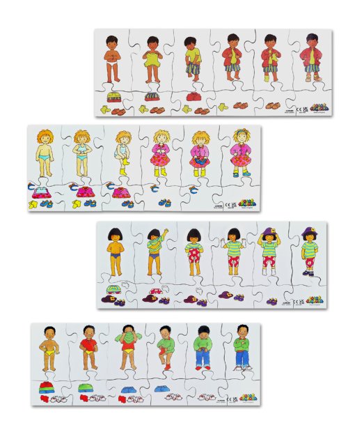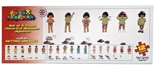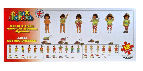Just Jigsaws 041 Oblékání - dřevěný puzzle set 4 x 12 dílů představuje krásně ilustrované akvarelové obrázky, které učí zábavnou formou správnou posloupnost v oblékání. Sada obsahuje 4 postavy v různé fázi oblékání, z nichž každá má 6 větších a 6 menších dílů, které do sebe zapadají a na sebe navazují. Každý větší díl zobrazuje postavu v určité fázi oblékání, pod kterou je vždy menší navazující díl, na kterém jsou nakresleny kusy oblečení, z nichž je vždy použit jeden kus, který je nutno obléct. Jakmile je postava oblečena, na spodním menším dílku již žádný kousek oblečení není. Děti si tak snadno procvičí názvy jednotlivých kusů oděvů.
