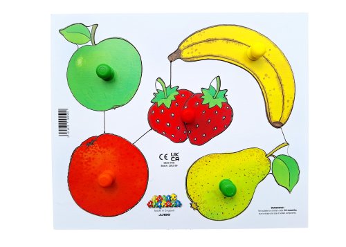 Just Jigsaws 150 Loupeme a krájíme plodiny 1 - dřevěné deskové puzzle 6 dílů představuje dřevěnou skládačku s kolíčky pro snadný úchop, která dětem krásně znázorňuje, jak vypadá ovoce i pod svojí slupkou. Cílem této skládačky je, aby děti správně přiřadily celé ovoce k jeho nakrájené variantě. S tímto naučným puzzle si děti osvojují názvy různých druhů ovoce, jejich barvy a tvary. Samotná hra zároveň pozitivně ovlivňuje rozvoj logického myšlení a formování prostorové představivosti, což z této na první pohled obyčejné skládačky dělá velmi zajímavou a edukativní hru. Sada obsahuje: pomeranč, jablko, banán, hrušku a jahodu.