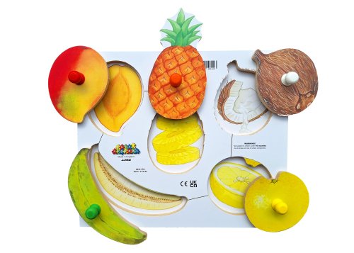 Just Jigsaws 152 Loupeme a krájíme plodiny 3 - dřevěné deskové puzzle 6 dílů představuje dřevěnou skládačku s kolíčky pro snadný úchop, která dětem krásně znázorňuje, jak vypadá exotické ovoce a kokosový ořech i pod svojí slupkou. Cílem této skládačky je, aby děti správně přiřadily ovoce a kokosový ořech k jeho nakrájené variantě. S tímto naučným puzzle si děti osvojují názvy různých druhů plodin, jejich barvy a tvary. Samotná hra zároveň pozitivně ovlivňuje rozvoj logického myšlení a formování prostorové představivosti, což z této na první pohled obyčejné skládačky dělá velmi zajímavou a edukativní hru. Sada obsahuje: mango, ananas, citron, kokos a plantain (zeleninový banán).