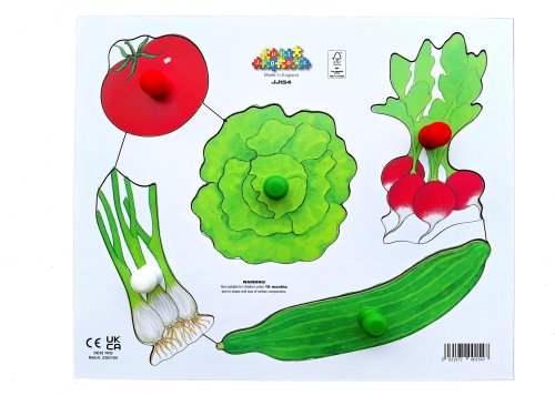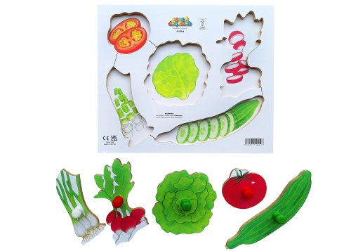 Just Jigsaws 154 Loupeme a krájíme plodiny 5 - dřevěné deskové puzzle 6 dílů představuje dřevěnou skládačku s kolíčky pro snadný úchop, která dětem krásně znázorňuje, jak vypadá zelenina i pod svojí slupkou. Cílem této skládačky je, aby děti správně přiřadily zeleninu k její nakrájené variantě. S tímto naučným puzzle si děti osvojují názvy různých druhů zeleniny, jejich barvy a tvary. Samotná hra zároveň pozitivně ovlivňuje rozvoj logického myšlení a formování prostorové představivosti, což z této na první pohled obyčejné skládačky dělá velmi zajímavou a edukativní hru. Sada obsahuje: rajče, salát, ředkvičku, okurku a jarní cibulku.