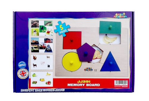 Just Jigsaws 391 Tvary a paměť - dřevěné deskové puzzle 6 dílů a 4 předlohy je naučná netradičně pojatá edukativní deska, zaměřená na výuku tvarů, barev a trénování paměti. Deska má 5 vyfrézovaných geometrických otvorů a 5 příslušných barevných puzzle dílků s kolíčky pro snadný úchop, plus boční otvor pro zasunutí předloh. Dodává se společně se 3 zalaminovanými listy formátu A4, na kterých je vždy 5 rozpoznatelných obrázků a jedním prázdným listem pouze s naznačenými tvary pro kopírování a dodělání dle vlastní fantazie. Vyberte si jednu ze čtyř tematických předloh, obsahující reálné fotografie a zasuňte do dřevěné desky. Poté zakryjte obrázky 5 příslušnými dřevěnými puzzle dílky a snažte si vzpomenout, pod kterým tvarem se ukrývá jaký obrázek. Tato paměťová deska představuje skvělý způsob zábavy a zlepšování paměťových schopností a zároveň učí děti barvy a tvary. Sada obsahuje: 1 hrací deska, 5 dílů různých tvarů a 4 předlohy a 1 prázdnou pro vlastní fantazii.