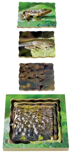 Just Jigsaws 604 Žába a její životní cyklus - dřevěné vrstvené puzzle 19 dílů. Objevujte s tímto netradičním puzzle životní cyklus žáby. Edukativní puzzle, díky kterému mohou děti zkoumat zázračné proměny přírody prostřednictvím skutečných fotografií. Vrstvené puzzle obsahuje obrázky 4 fází vývojového cyklu. K vidění jsou reálné fotky: vajíček, pulců, měnícího se pulce a dospělé žáby. Sada obsahuje celkem 18 kusů puzzle dílků a 1 základnu s rámečkem.