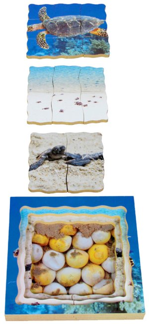 Just Jigsaws 605 Želva a její životní cyklus - dřevěné vrstvené puzzle 19 dílů. Objevujte s tímto netradičním puzzle životní cyklus želvy. Edukativní puzzle, díky kterému mohou děti zkoumat zázračné proměny přírody prostřednictvím skutečných fotografií. Vrstvené puzzle obsahuje obrázky 4 fází vývojového cyklu. K vidění jsou reálné fotky: vajíček, líhnutí, malých želviček a dospělé želvy. Sada obsahuje celkem 18 kusů puzzle dílků a 1 základnu s rámečkem.