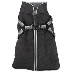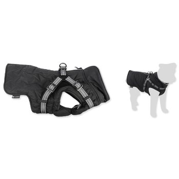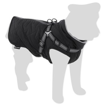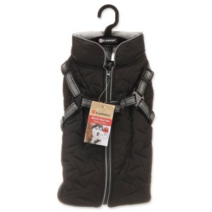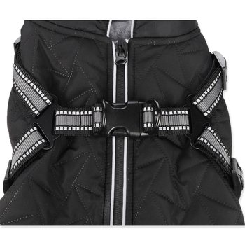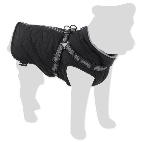 integrovaný postroj s reflexními proužky, prošívaný voděodolný materiál, příjemná fleecová podšívka, pohodlné zapínání na hřbetě psa.