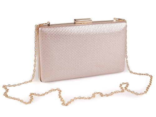 Malá společenská kabelka vyzařuje eleganci a luxus, má metalický lesk. Povrch má zajímavou kostičkovou strukturu. Zdobí ji výrazné lesklé zapínání a rámeček po celém obvodu. Kabelka je pevně vyztužená, její součástí je dlouhý odnímatelný řetízek na karabiny. Můžete ji nosit v ruce nebo jako crossbody přes rameno či do kříže.