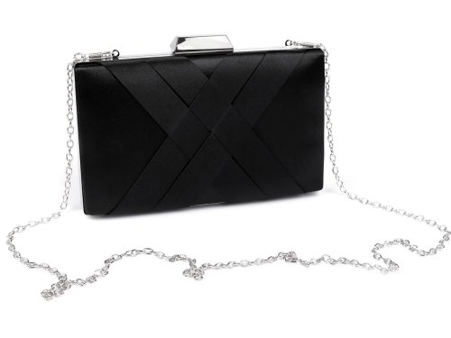 Společenská saténová kabelka vyzařuje eleganci a luxus. Na přední straně je ozdobená zkříženou aplikací. Kabelka má po celém obvodu kovový rámeček. Je pevně vyztužená, její součástí je dlouhý odnímatelný řetízek na karabiny.