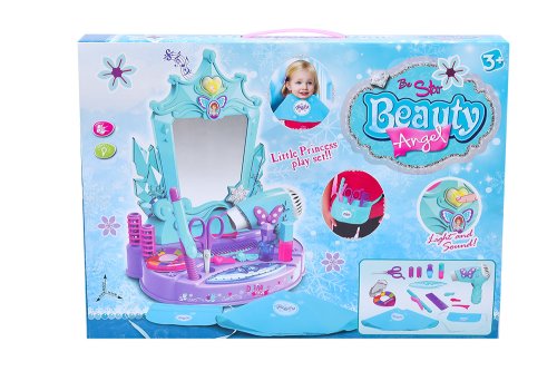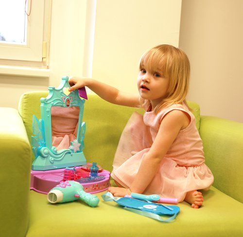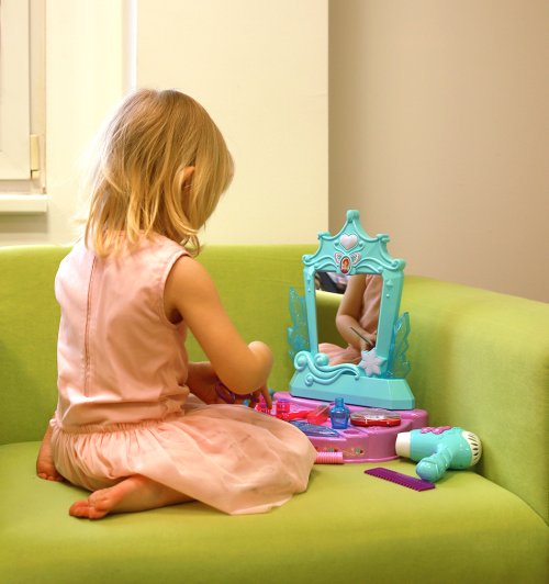 Toaletní zrcadlo s funkčním fénem. Zrcadlo hraje melodii. Součástí velké množství příslušenství (malovátka, sponky…)