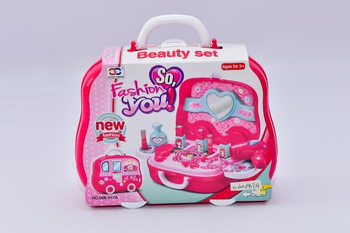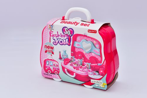 Kosmetický salon v praktickém uzavíratelném kufříku. Fén, prstýnky, náhrdelníky, hřebínky…