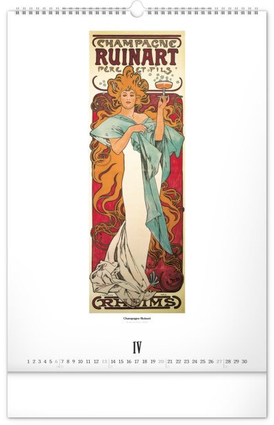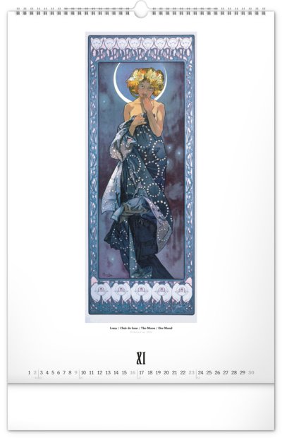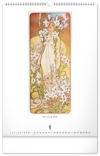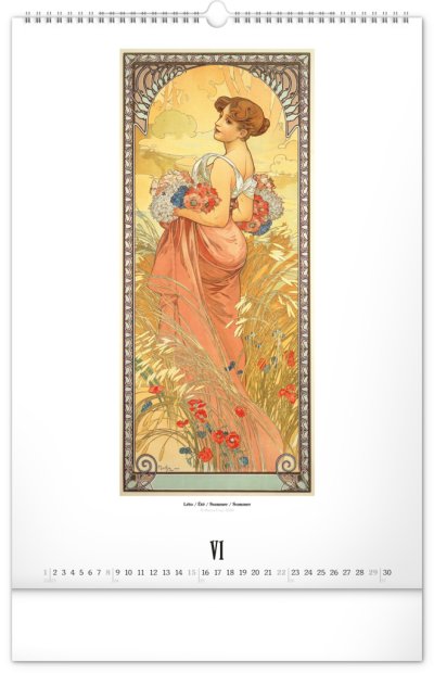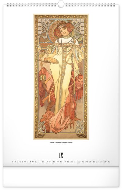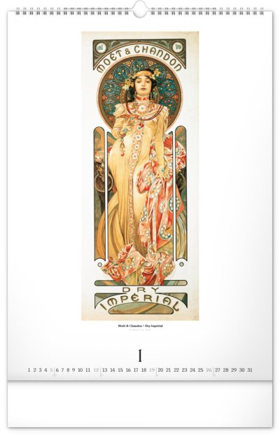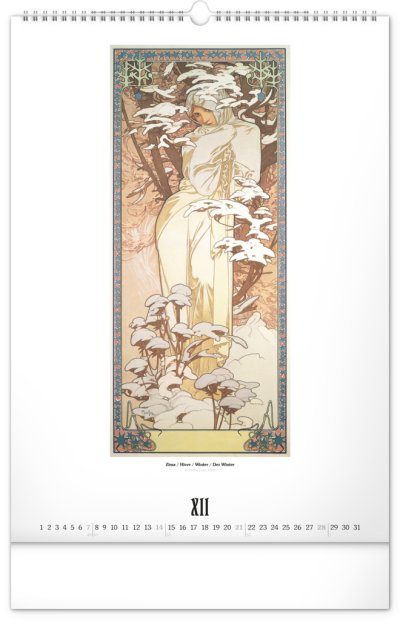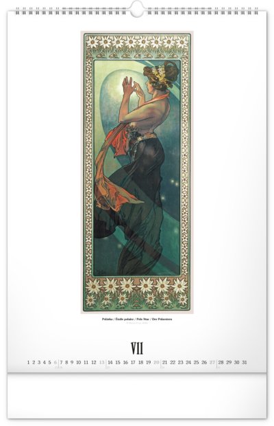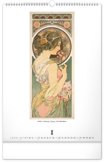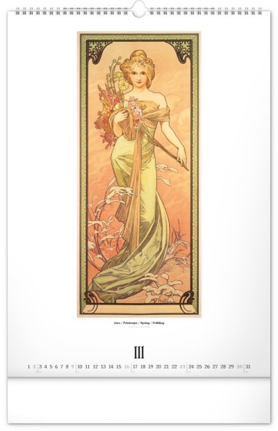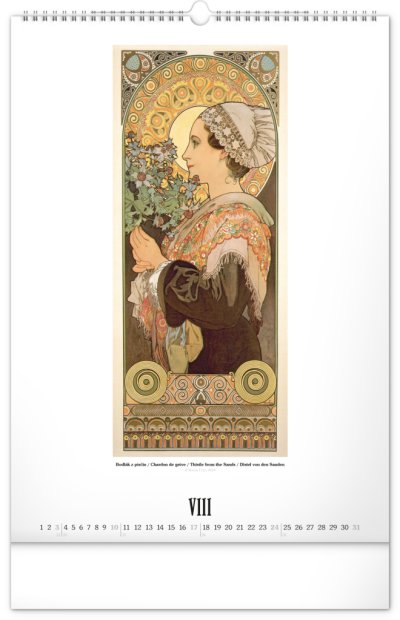 Česko-slovenský nástěnný kalendář ve velkém formátu s obrazy oblíbeného secesního malíře českého původu.