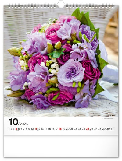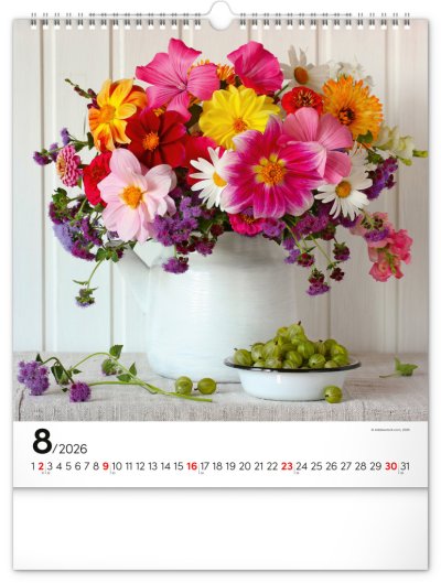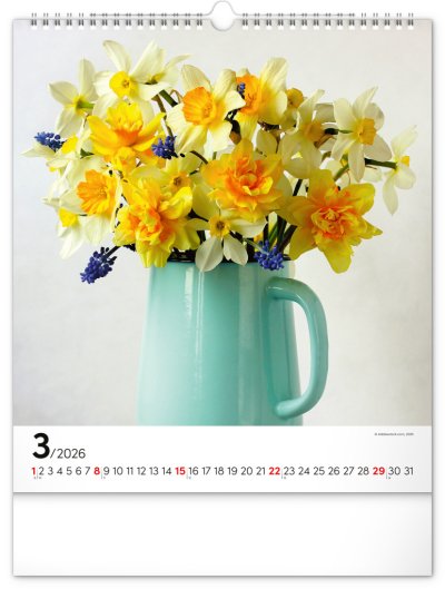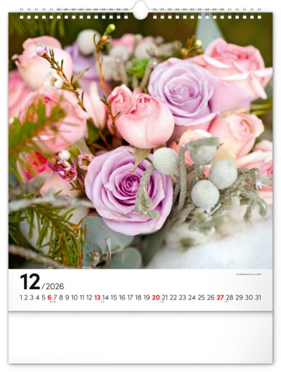 Nástěnný kalendář s barevnými fotografiemi rozkvetlých květin v originálních vazbách.