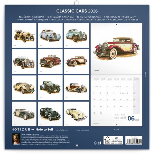 Dvanáct unikátních a do detailu propracovaných kreseb starých automobilů v podání světoznámého malíře Václava Zapadlíka. Potěší nejen sběratele, ale i milovníky veteránů. Kalendář obsahuje přehledné kalendárium od září 2025 do prosince 2026 v osmi jazycích, měsíční fáze, důležité svátky a prostor pro poznámky na každý den. Kalendář je součástí kolekce Plastic Free, je zabalený v obálce z recyklovaného papíru a vytištěný na recyklovaném strukturovaném papíře s vysokou gramáží.