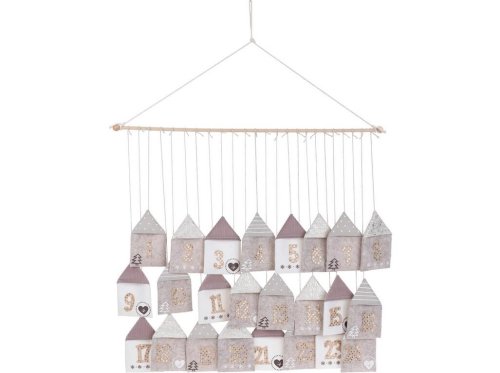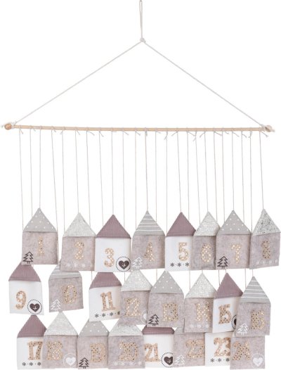 roměry: 70 x 60 cm materiál: plsť, provázky, dřevěná hrazda barva: krémová, růžová, šedá se zlatými glitrovými dekoracemi motiv domky s čísly 1 - 24